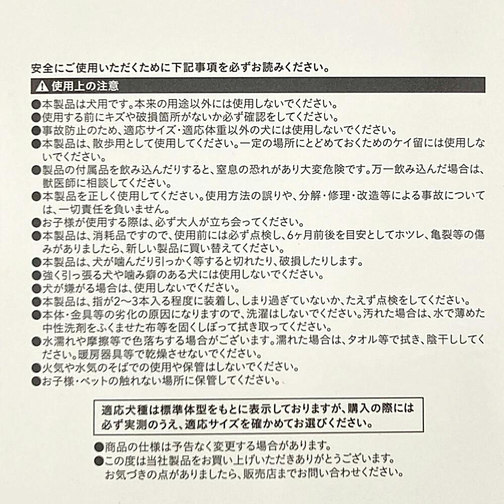 ●本品は犬用です。本来の用途以外には使用しないでください●使用する前にキズや破損個所がないか必ず確認をして下さい●事故防止のため、適応サイズ・適応体重以外の犬には使用しないでください●本製品は散歩用として使用してください。等