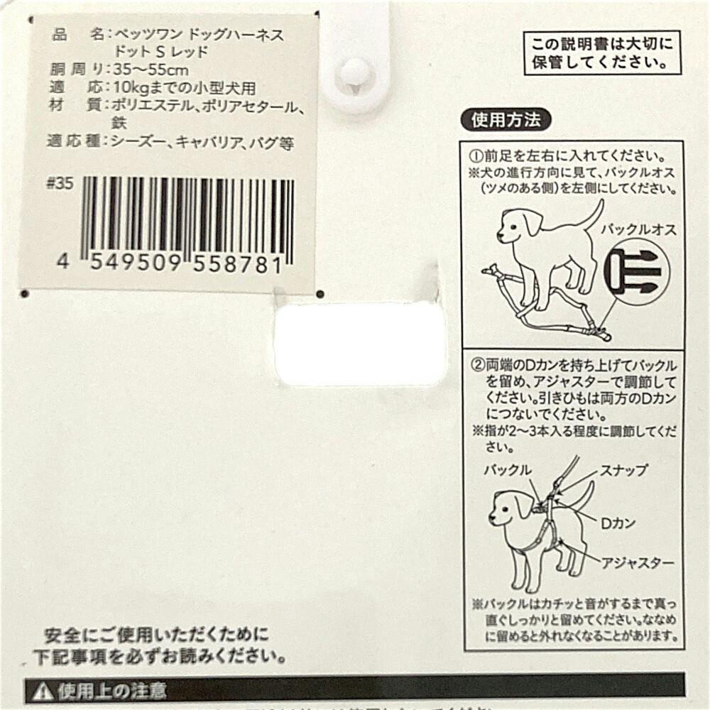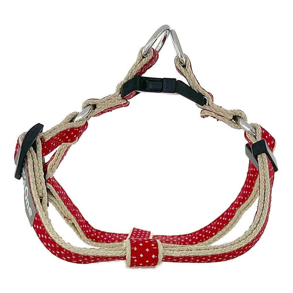 1.前足を左右に入れてください。※犬の進行方向に見て、バックルオス(ツメのある側)を左側にしてください。2.両側のDカンを持ち上げてバックルを留め、アジャスターで調整してください。引きひもは両側のDカンにつないでください。等