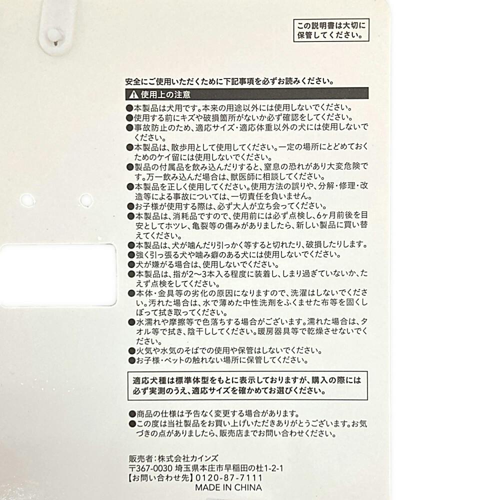●本品は犬用です。本来の用途以外には使用しないでください●使用する前にキズや破損個所がないか必ず確認をして下さい●事故防止のため、適応サイズ・適応体重以外の犬には使用しないでください●本製品は散歩用として使用してください。等