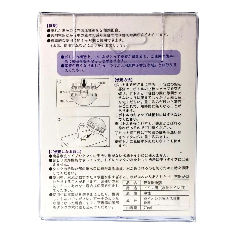 ●ボトルの構造上、中に水が入って薬液が薄まると、ご使用の後半に急に薬液がなくなることがあります。●薬液が無くなりましたら「つけかえ用液体芳香洗浄剤」とお取り替えください。