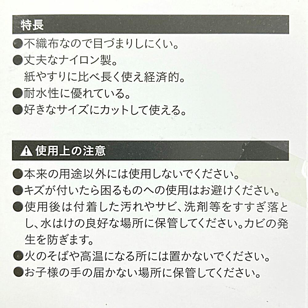 ●不織布なので目づまりしにくい。●丈夫なナイロン製。紙やすりに比べ長く使え経済的。●耐水性に優れている。●好きなサイズにカットして使える。
