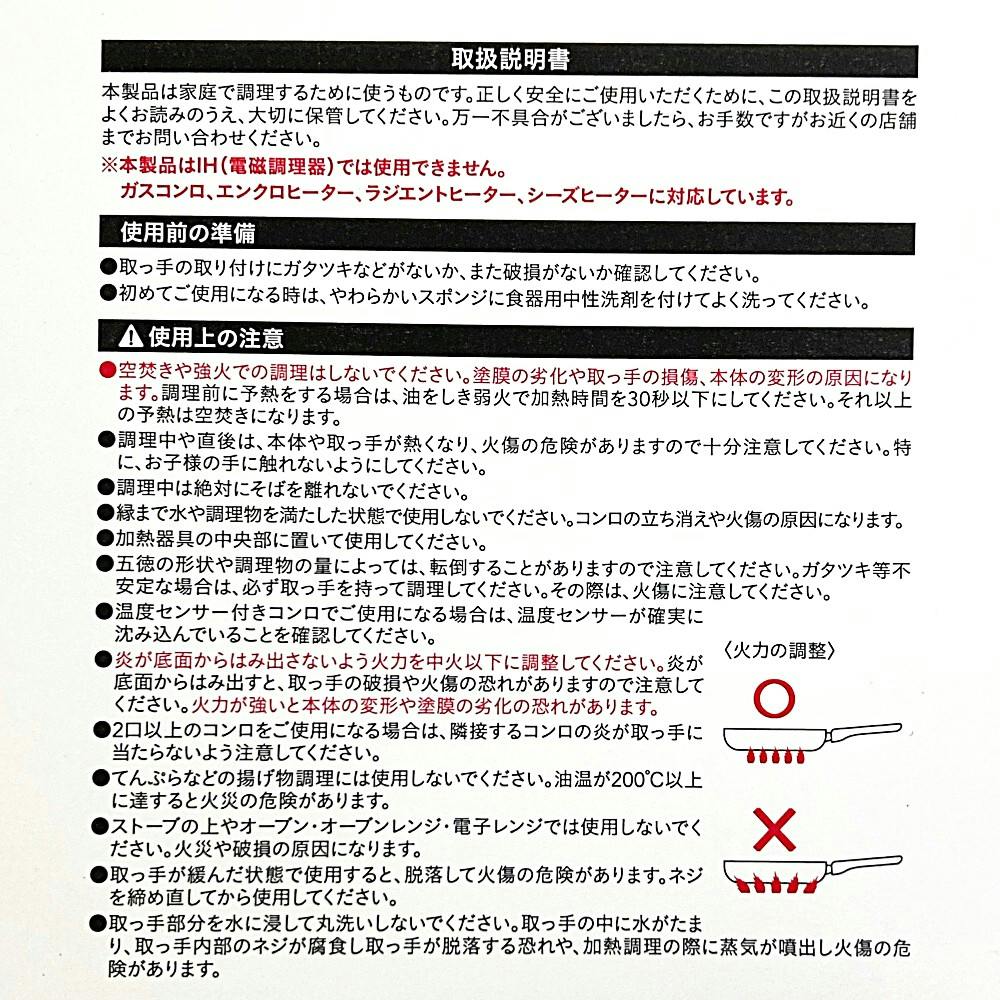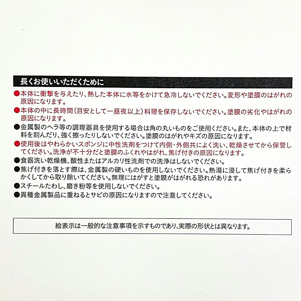 ●初めてご使用になる時は、内面(調理面)全体に油をなじませてからご使用ください。 ●表面コーティング保護のためにも、火力は中火以下でご使用ください。