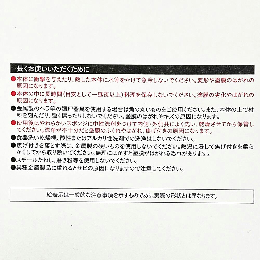 ●初めてご使用になる時は、内面(調理面)全体に油をなじませてからご使用ください。 ●表面コーティング保護のためにも、火力は中火以下でご使用ください。