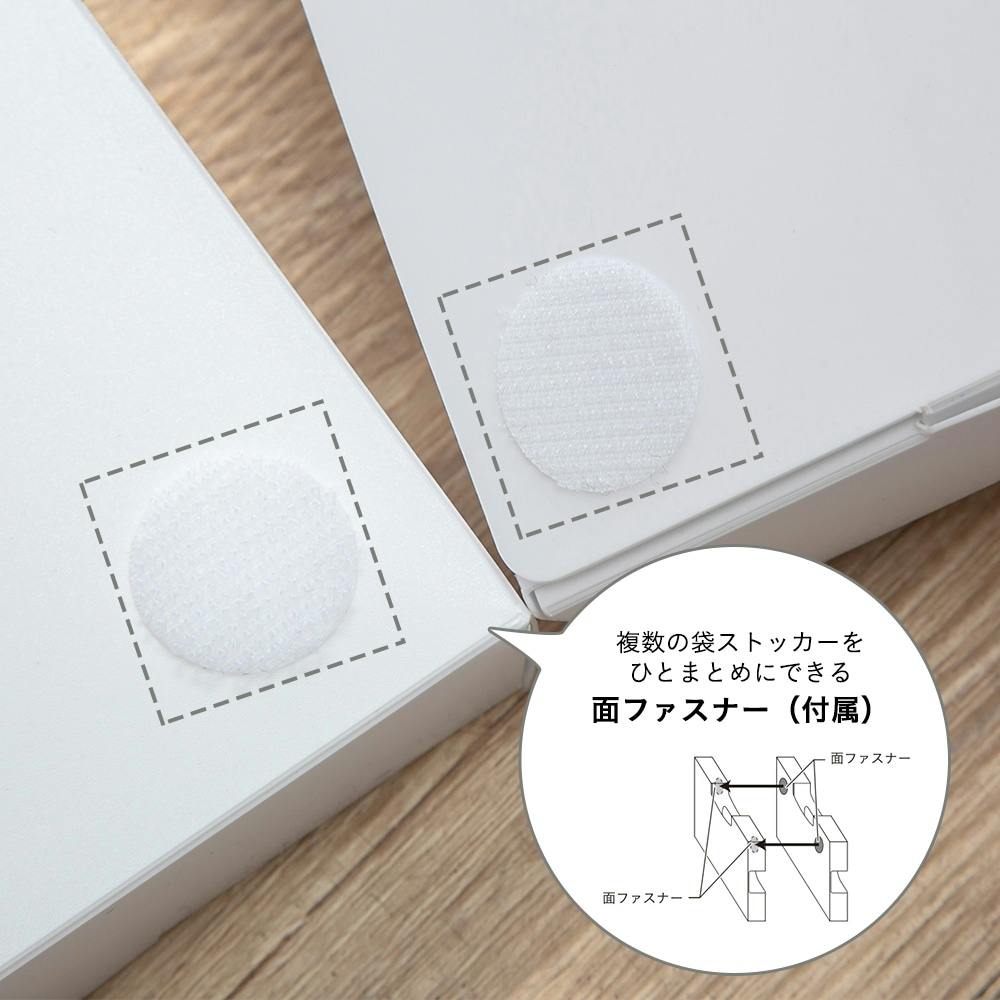 ●ポリ袋や保存バッグなどをすっきり収納。●インデックスシール付き●付属の面ファスナーでケースを連結すれば、数種類の袋をひとまとめにできる。