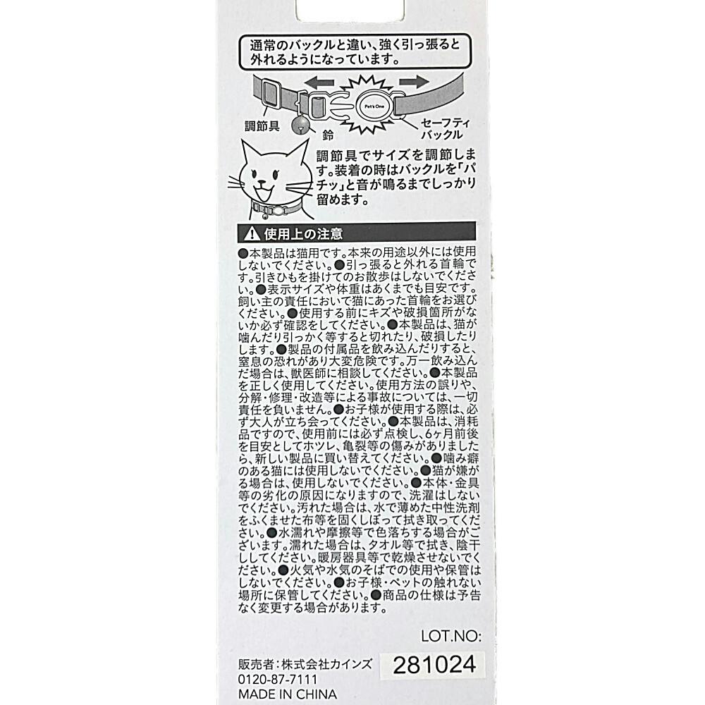 ●本製品は猫用です。本来の用途以外には使用しないでください。●引っ張ると外れる首輪です。引きひもを掛けてのお散歩はしないでください。●表示サイズや体重はあくまでも目安です。飼い主の責任において猫にあった首輪をお選びください。