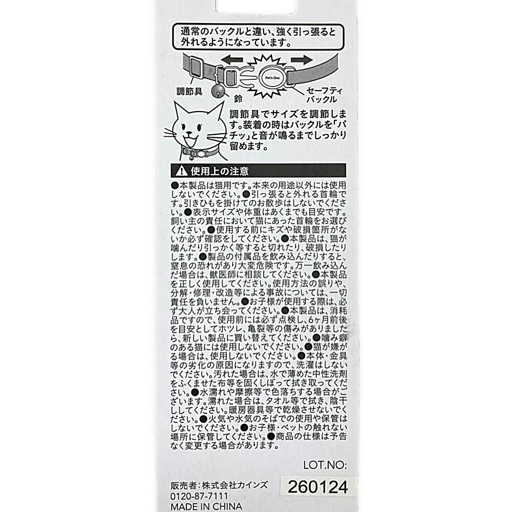 ●本製品は猫用です。本来の用途以外には使用しないでください。●引っ張ると外れる首輪です。引きひもを掛けてのお散歩はしないでください。●表示サイズや体重はあくまでも目安です。飼い主の責任において猫にあった首輪をお選びください。等