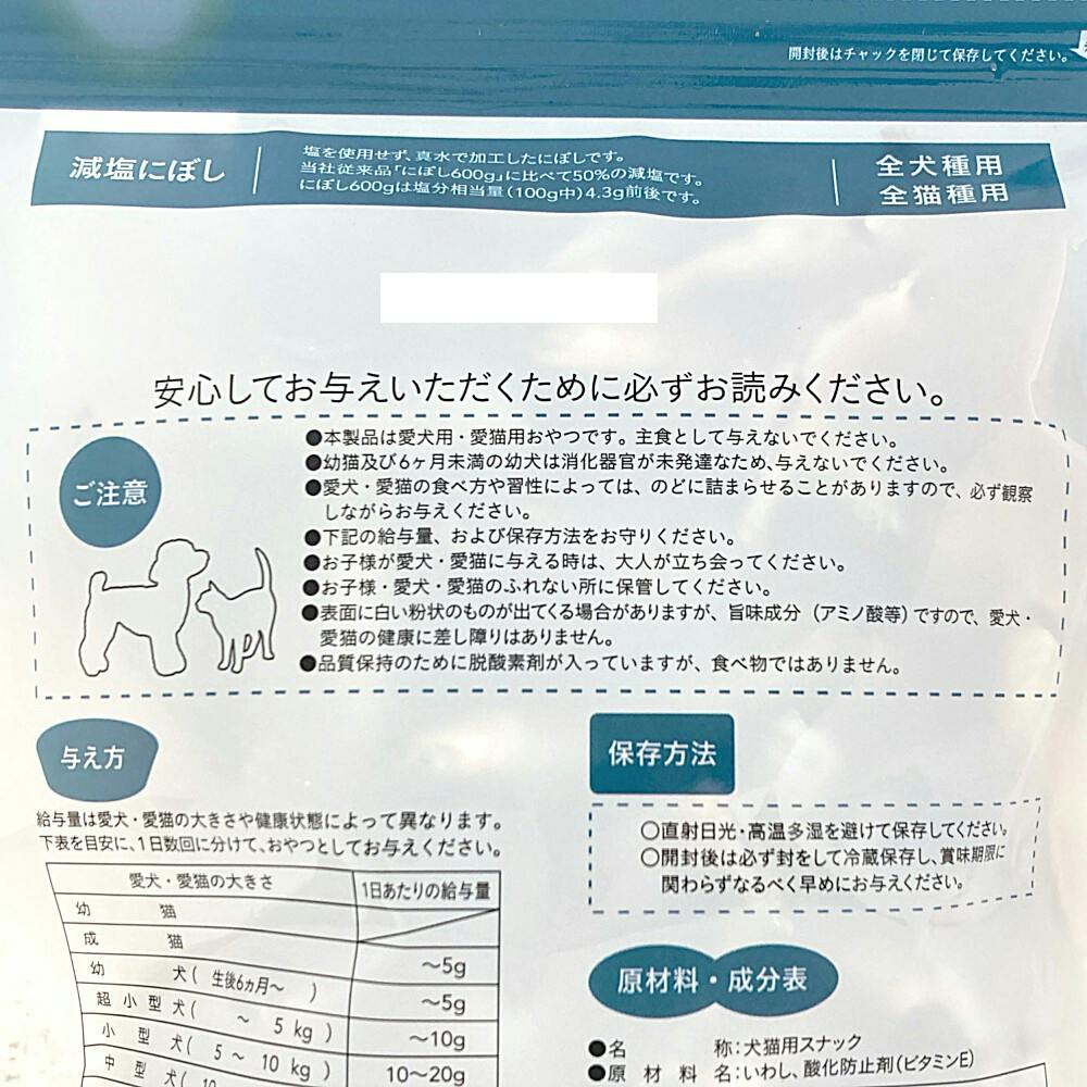 ●塩を使用せず、真水で加工したにぼしです。●カルシウム●国産●全犬種用●全猫種用●50%減塩