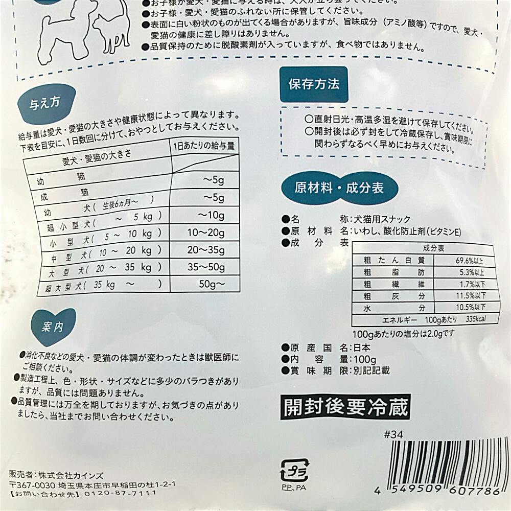 ●本製品は愛犬用・愛猫用おやつです。主食として与えないでください。●幼猫及び6ヶ月未満の幼犬は消化器官が未発達なため、与えないでください。
