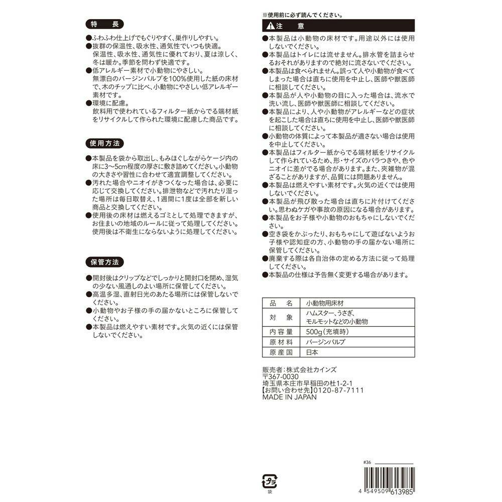 ●本製品は小動物の床材です。用途以外には使用しないでください。●本製品はトイレには流せません。排水管を詰まらせる恐れがありますので絶対に流さないでください。等