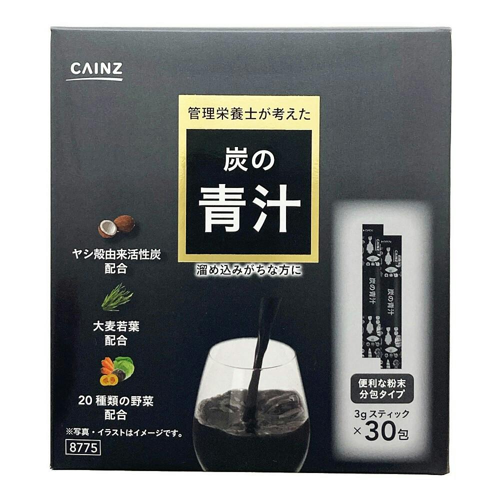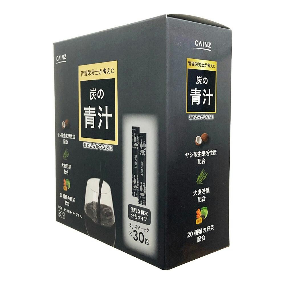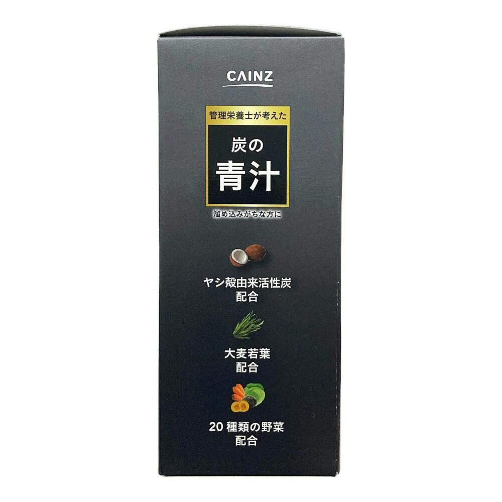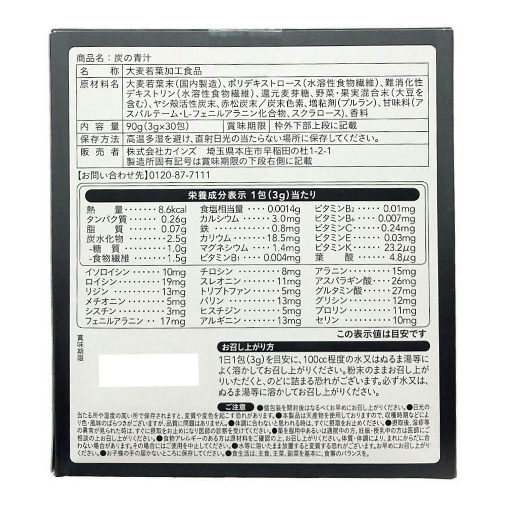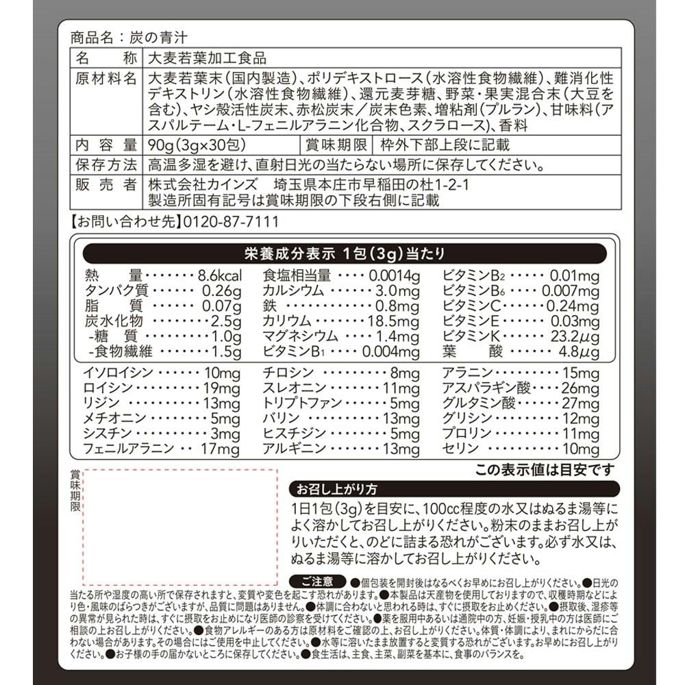 大麦若葉末(国内製造)、ポリデキストロース(水溶性食物繊維)、難消化性デキストリン(水溶性食物繊維)、還元麦芽糖、野菜・果実混合末(大豆を含む)、ヤシ殻活性炭末、赤松炭末/炭末色素、増粘剤(プルラン)