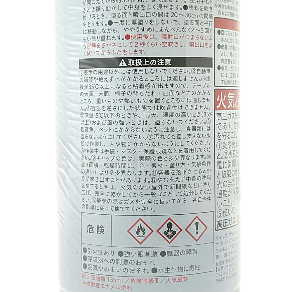 ●引火性あり●強い眼刺激●臓器の障害●呼吸器への刺激のおそれ●眠気やめまいのおそれ●水生生物に毒性●第2石油類135ml●危険等級3●火気厳禁