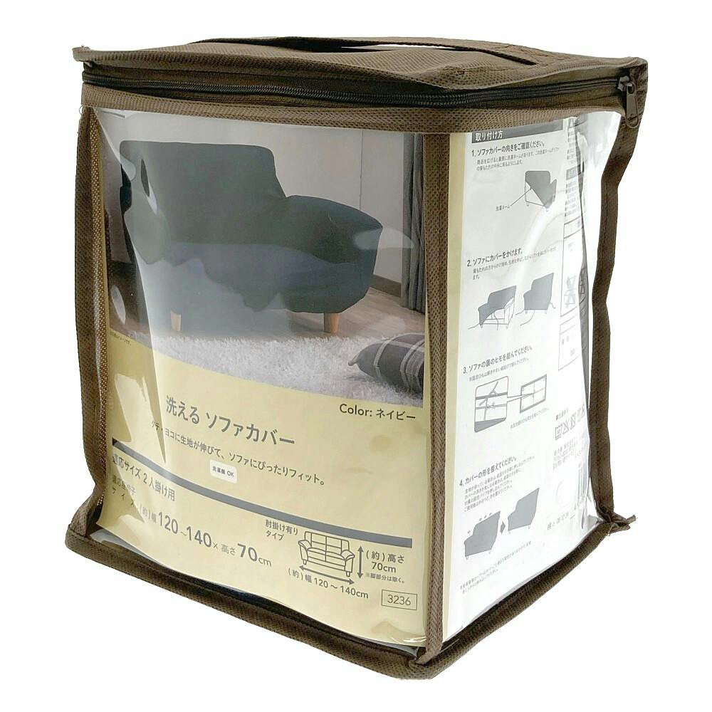 洗えるソファカバー レクト ネイビー 2人用 幅120~140cm 高さ70cm 洗濯機OK 肘掛け有りタイプ ソファーカバー (カバーのみ)