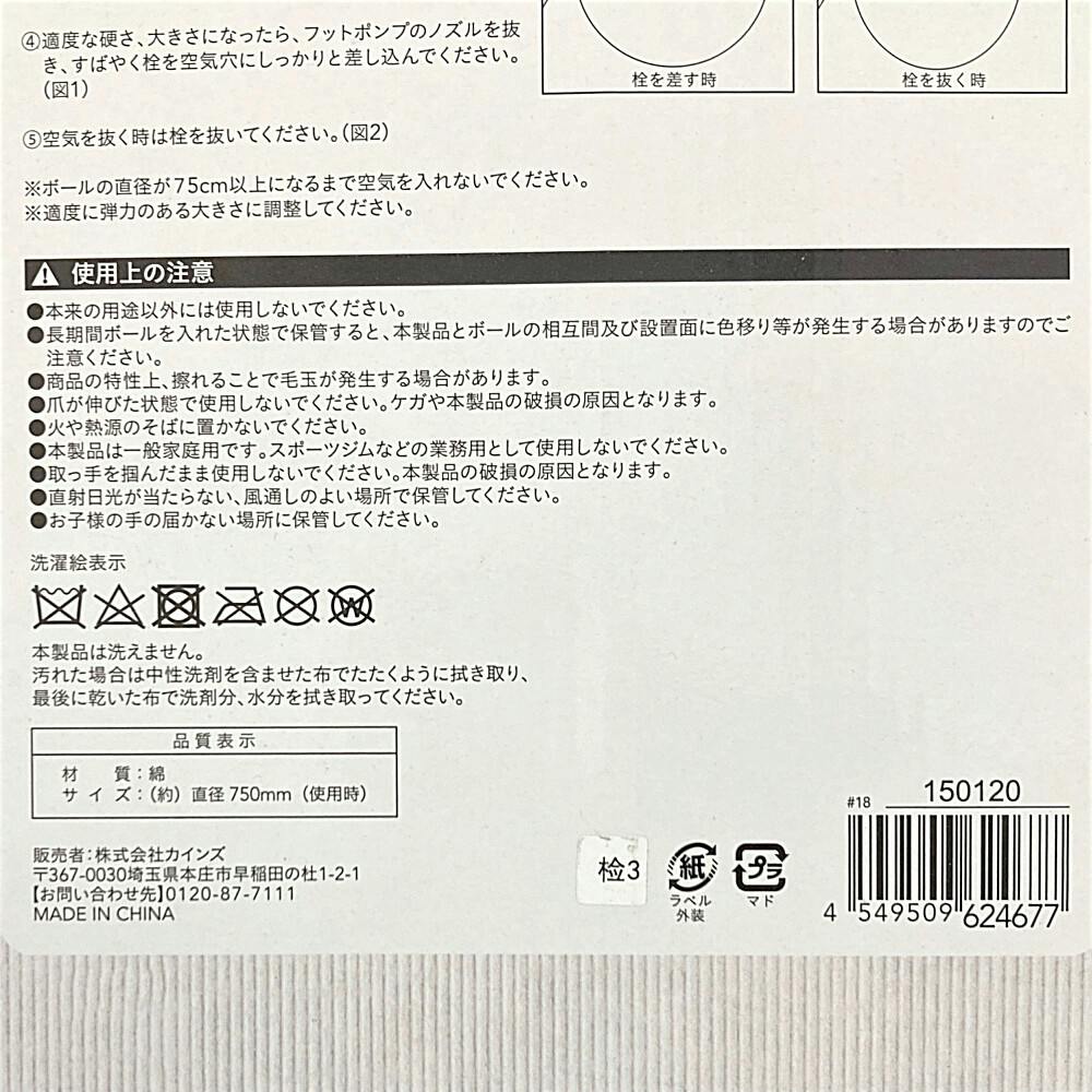 ①ボールの空気を抜き、栓が見えるようにカバーをかぶせます。②ボールにミニポンプ、または市販のボール用ポンプノズルをしっかりと差し込みます。③ボールとノズルがずれないように手で押さえながら、ゆっくりと空気を入れてください。