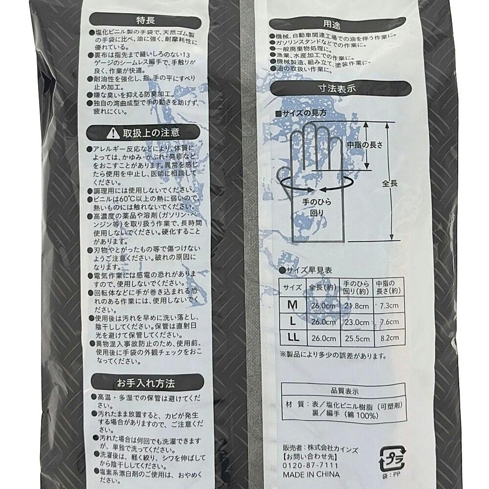 ●塩化ビニル製の手袋で、天然ゴム製の手袋に比べ、油に強く、耐摩耗性に優れている ●裏布は指先まで縫いしろのない13ゲージのシームレス編手で手触りが良く、作業が快適 ●耐油性を強化し、指、手の平にすべり止め加工