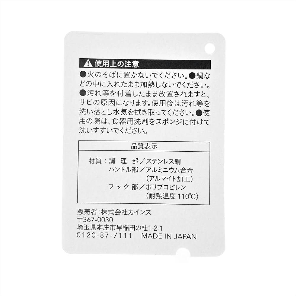 ●調理部/ステンレス鋼 ●ハンドル部/アルミニウム合金(アルマイト加工) ●フック部/ポリプロピレン