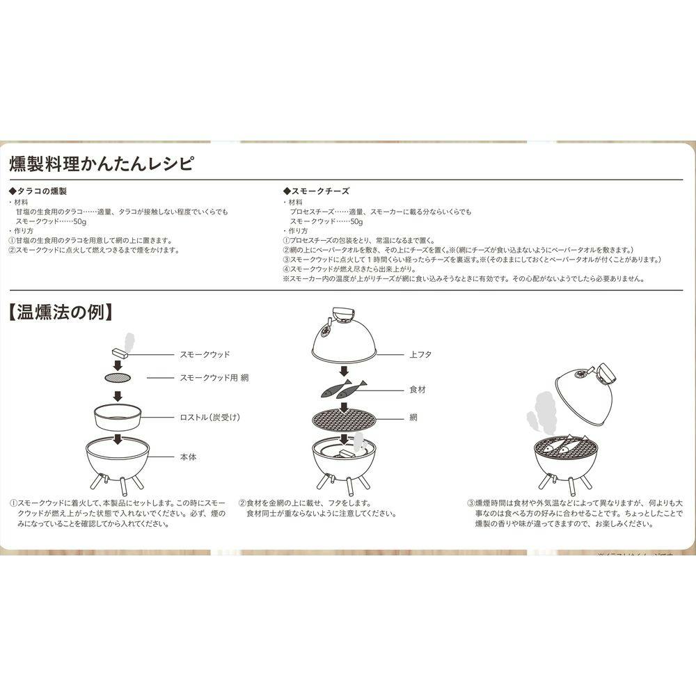 上フタ(温度計付き)×1、本体×1、網×1、ロストル(炭受け)×1、脚×3、通気フタ×2、取っ手×1、ネジ(小)×3、蝶ナット×3、脚用ネジ×3、ワッシャー×3、網用持ち手×1、スプリングワッシャー×3、スモークウッド用網