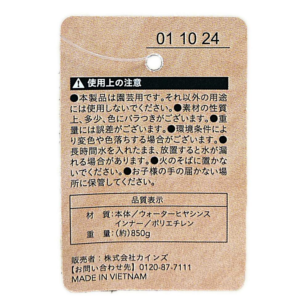 ●本製品は園芸用です。それ以外の用途には使用しないでください。●素材の性質上、多少、色にバラつきがございます。●重量には誤差がございます。●環境条件により変色や色落ちする場合がございます。●長時間水を入れたまま、放置すると水が漏れる場合があります。