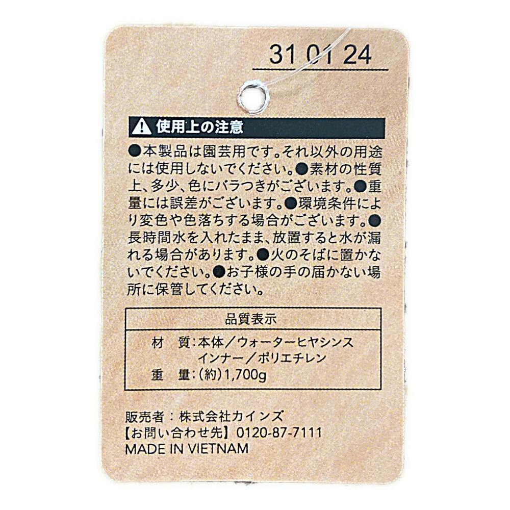 ●本製品は園芸用です。それ以外の用途には使用しないでください。●素材の性質上、多少、色にバラつきがございます。●重量には誤差がございます。●環境条件により変色や色落ちする場合がございます。●長時間水を入れたまま、放置すると水が漏れる場合があります。