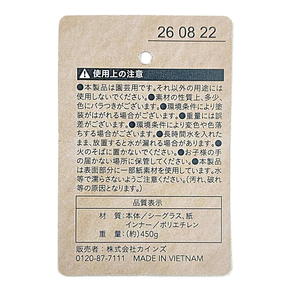 ●本製品は園芸用です。それ以外の用途には使用しないでください。●素材の性質上、多少、色にバラつきがございます。●重量には誤差がございます。●環境条件により変色や色落ちする場合がございます。●長時間水を入れたまま、放置すると水が漏れる場合があります。