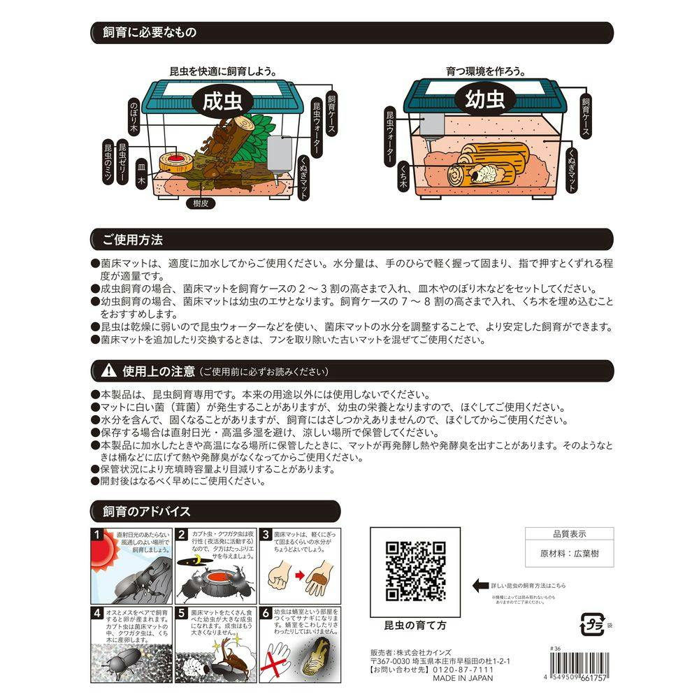 ●菌床マットは、適度に加水してからご使用ください。水分量は、手のひらで軽く握って固まり、指で押すとくずれる程度が最適です。●成虫飼育の場合、菌床マットを飼育ケースの2~3割の高さまで入れ、皿木やのぼり木などをセットしてください。等