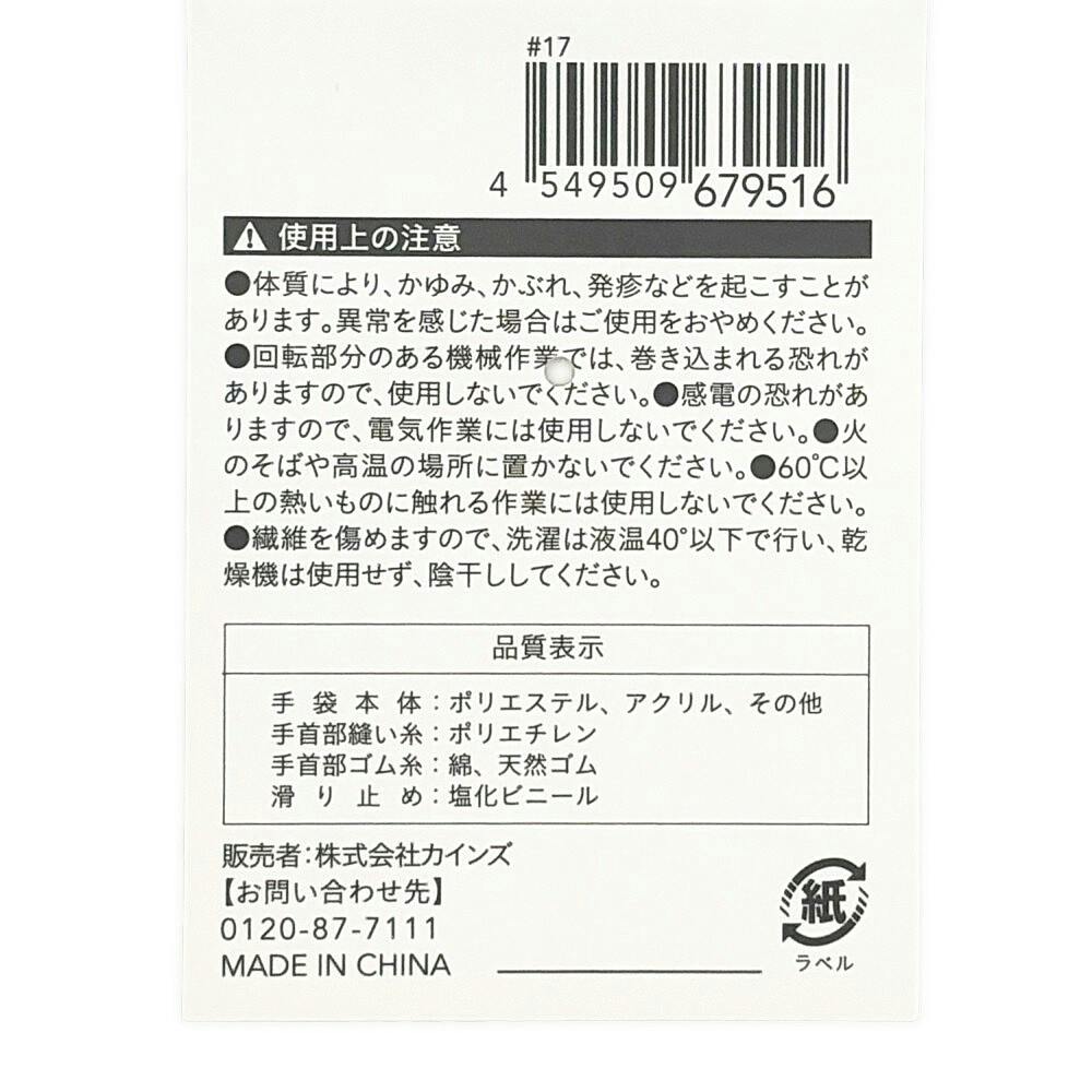 手袋:ポリエステル、アクリル、その他 すべり止め:塩化ビニル樹脂