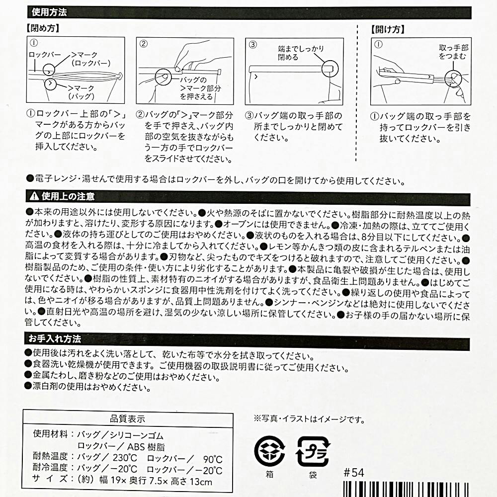 本製品は食品衛生法の規格に適合しています。電子レンジ・湯せんで使用する場合はロックバーを外し、バッグの口を開けてから使用してください。