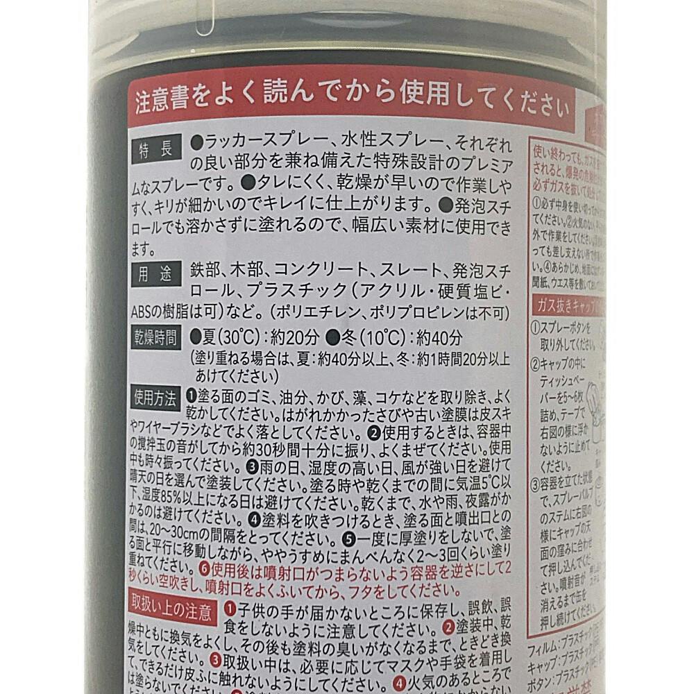 ●木部・鉄部・コンクリート・発泡スチロール・プラスチック ●仕上性・多用性・乾燥性 ●ラッカースプレー、水性スプレー、それぞれの良い部分を兼ね備えた特殊設計のプレミアムスプレーです