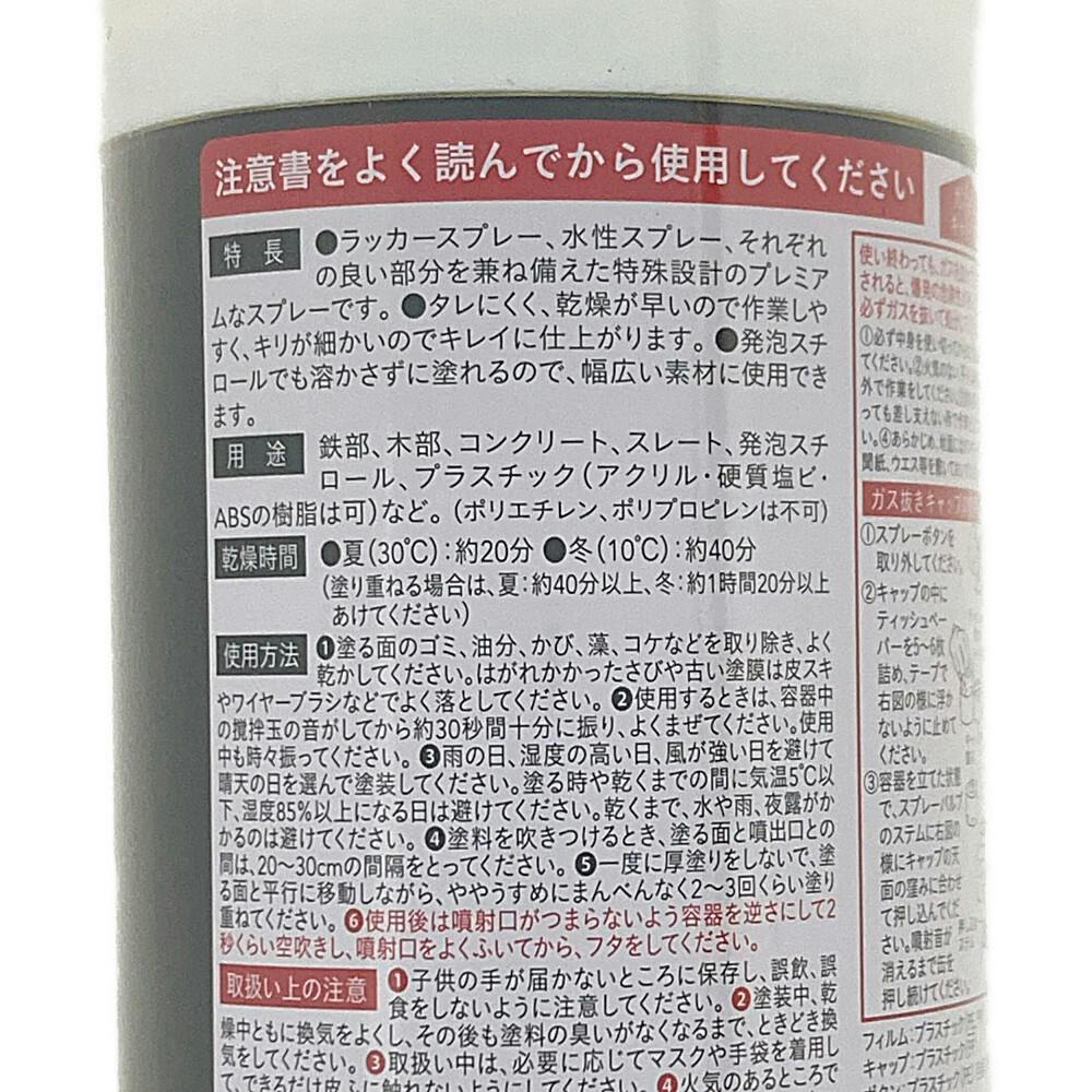 ●木部・鉄部・コンクリート・発泡スチロール・プラスチック ●仕上性・多用性・乾燥性 ●ラッカースプレー、水性スプレー、それぞれの良い部分を兼ね備えた特殊設計のプレミアムスプレーです