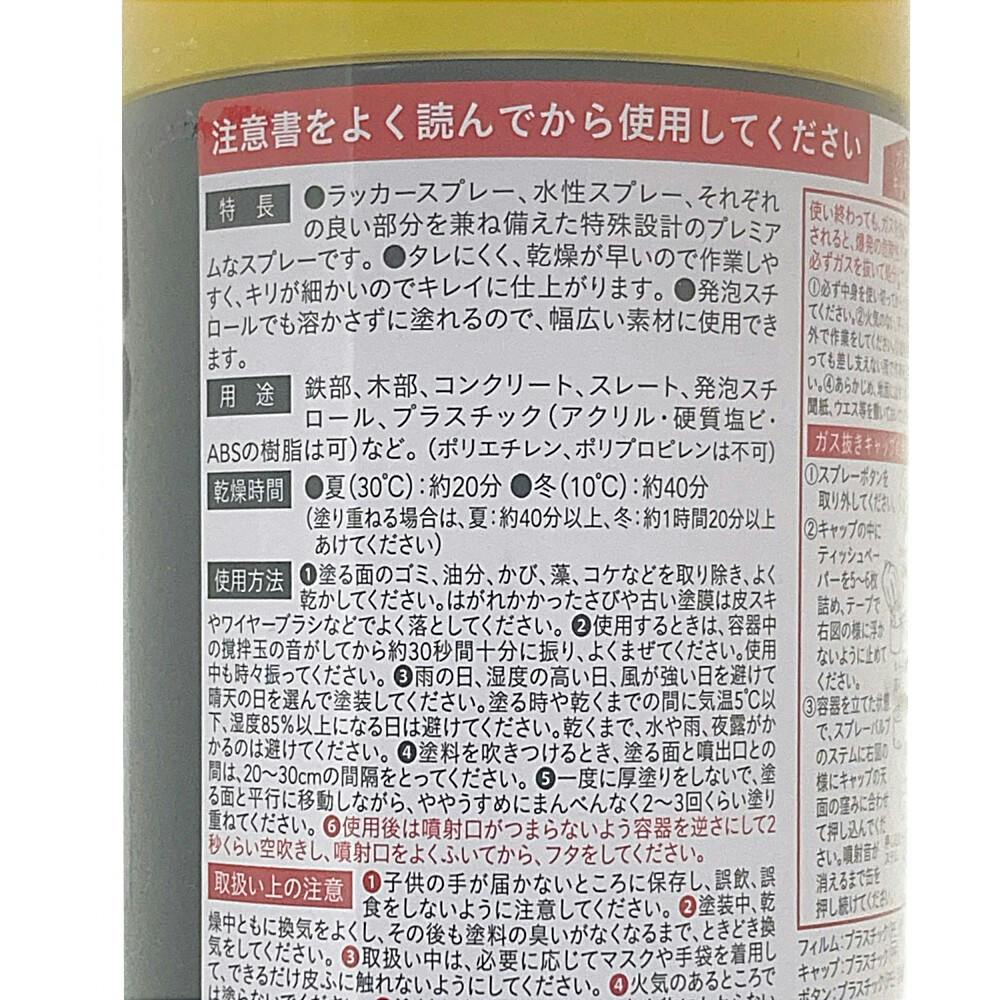 ●木部・鉄部・コンクリート・発泡スチロール・プラスチック ●仕上性・多用性・乾燥性 ●ラッカースプレー、水性スプレー、それぞれの良い部分を兼ね備えた特殊設計のプレミアムスプレーです