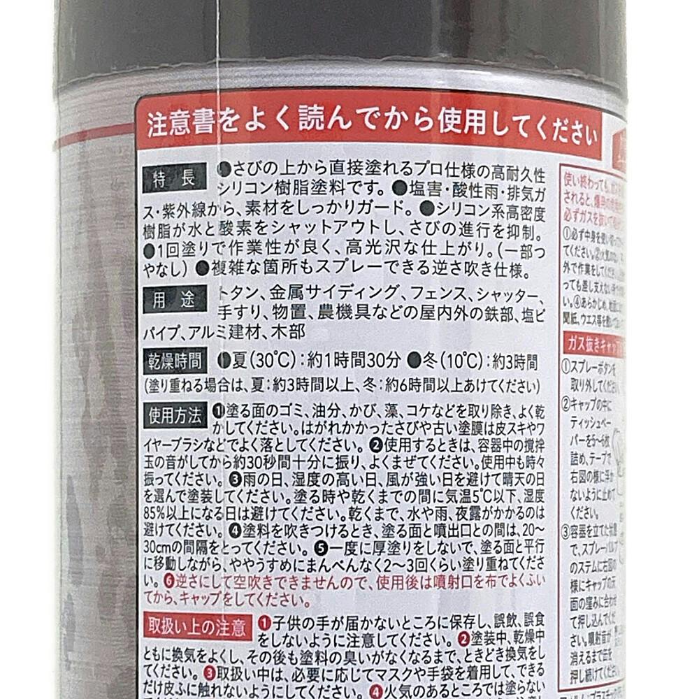 ●さびを落とさず、直接塗ることができます。●シリコン系高密度樹脂が水と酸素をシャットアウトし、さびの進行を抑えます。●高耐久シリコン樹脂なので、塩害・酸性雨・排気ガス・紫外線から、素材をしっかりガードします。●1回塗りで乾きが速く、作業性が抜群です。