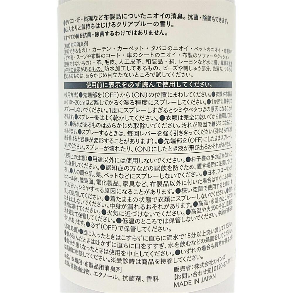 ●汗・タバコ・料理など布製品についたニオイの消臭。抗菌・除菌(すべての菌を抗菌・除菌するわけではありません)もできます ●ふんわりと気持ちはじけるクリアブルーの香り
