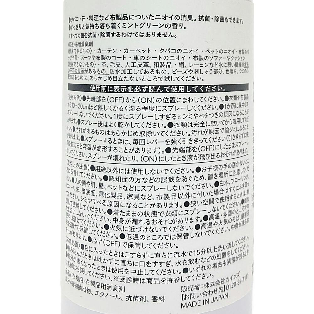 ●タバコ・汗・料理など布製品についたニオイの消臭。抗菌、除菌もできます ●すっきりと気持ち落ち着くミントグリーンの香り ※すべての菌を抗菌・除菌するわけではありません