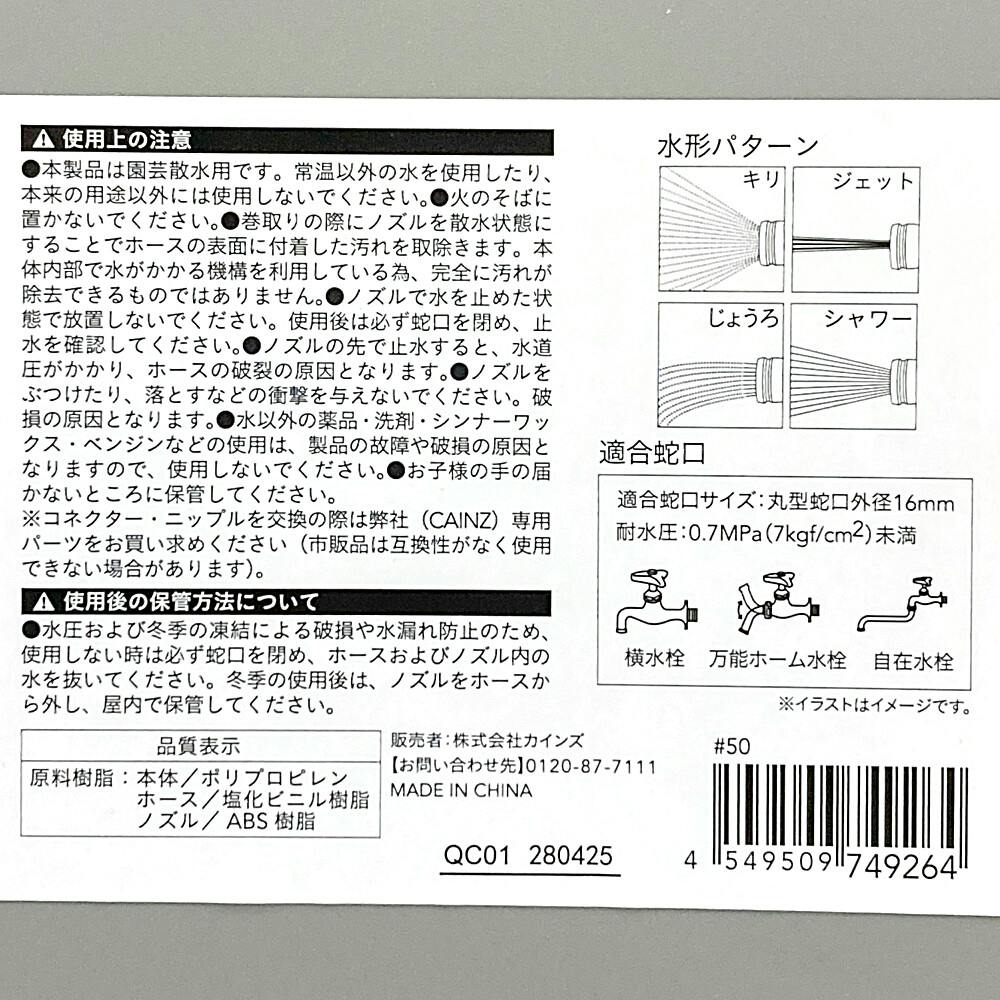 カインズ 巻きながら洗えるホース付きリール 長さ15m 外径11.5mm 内径7.5mm 適合蛇口丸型16mm ノズルパターン4種類