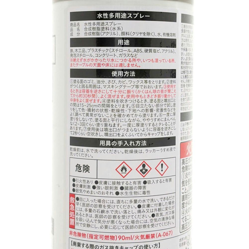 ●目立たない部分で試し塗りをして、乾燥性、霧の状態、下地への影響、付着性等をよく調べて異状がないことを確認してください。●塗る前に、容器をよく振ってかき混ぜ、カラカラと音がしてから更に30秒位振り、塗装中も時々振ってかきまぜてください。