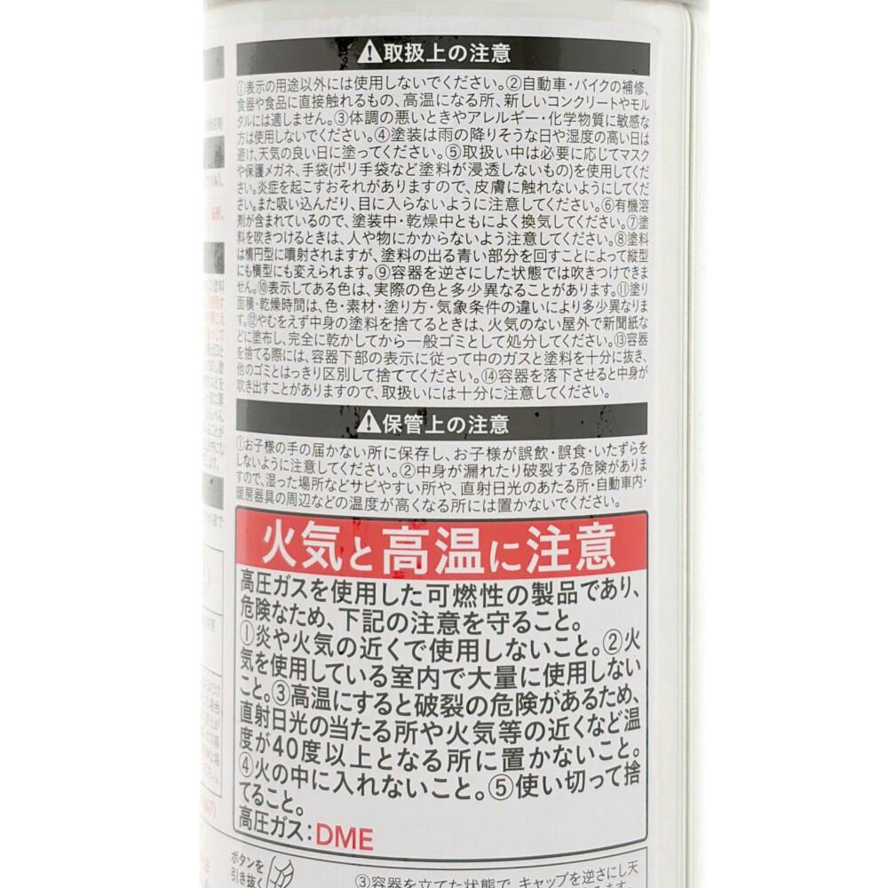 ●消防法上の非危険物●鉛・クロム化合物を使用していません。●回しやすいパターン変更ノズル付(だ円吹き) ●使用後容易に且つ安全に廃棄できるガス抜きキャップ付きです。
