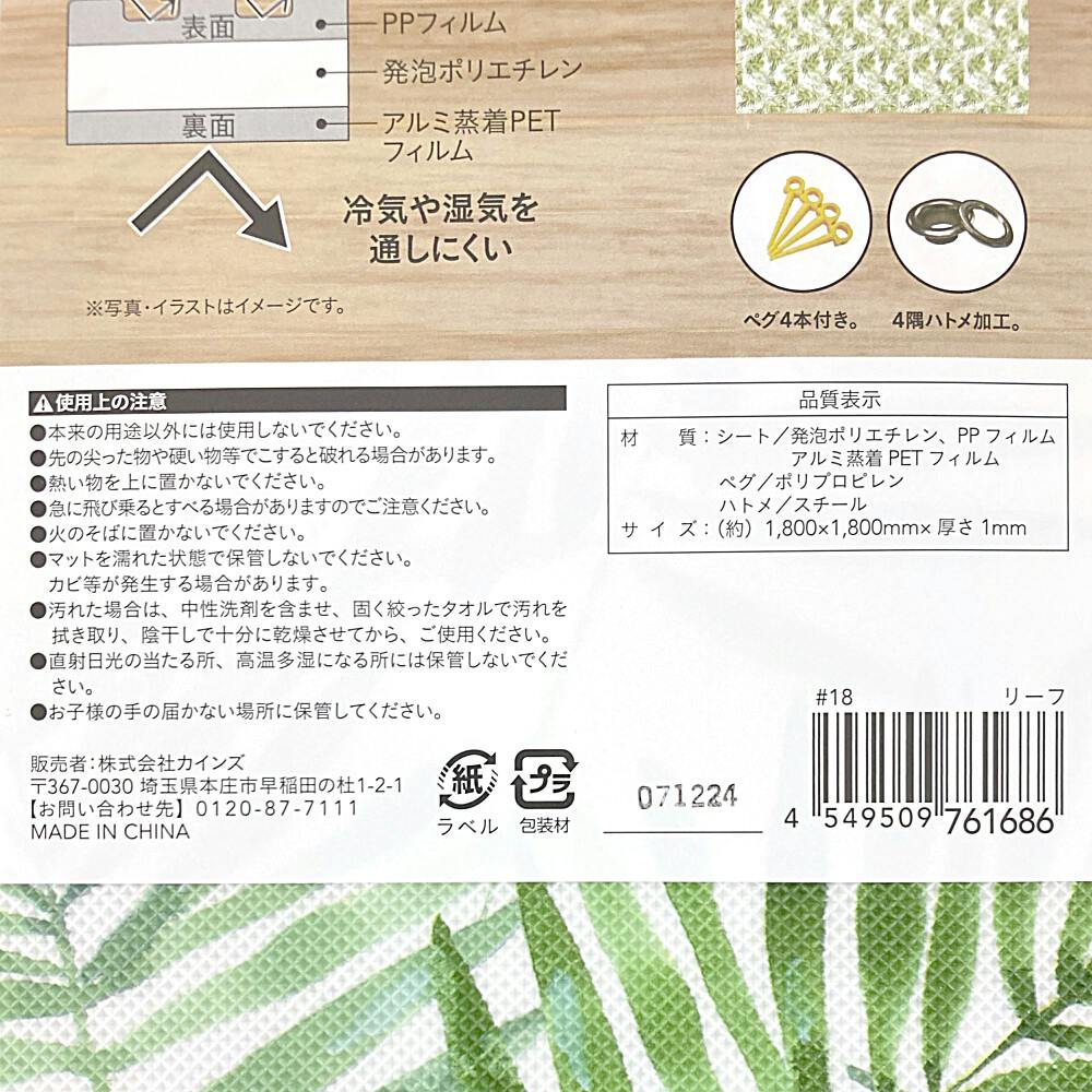 ●シート/発泡ポリエチレン、PPフィルム、アルミ蒸着PETフィルム●ペグ/ポリプロピレン●ハトメ/スチール