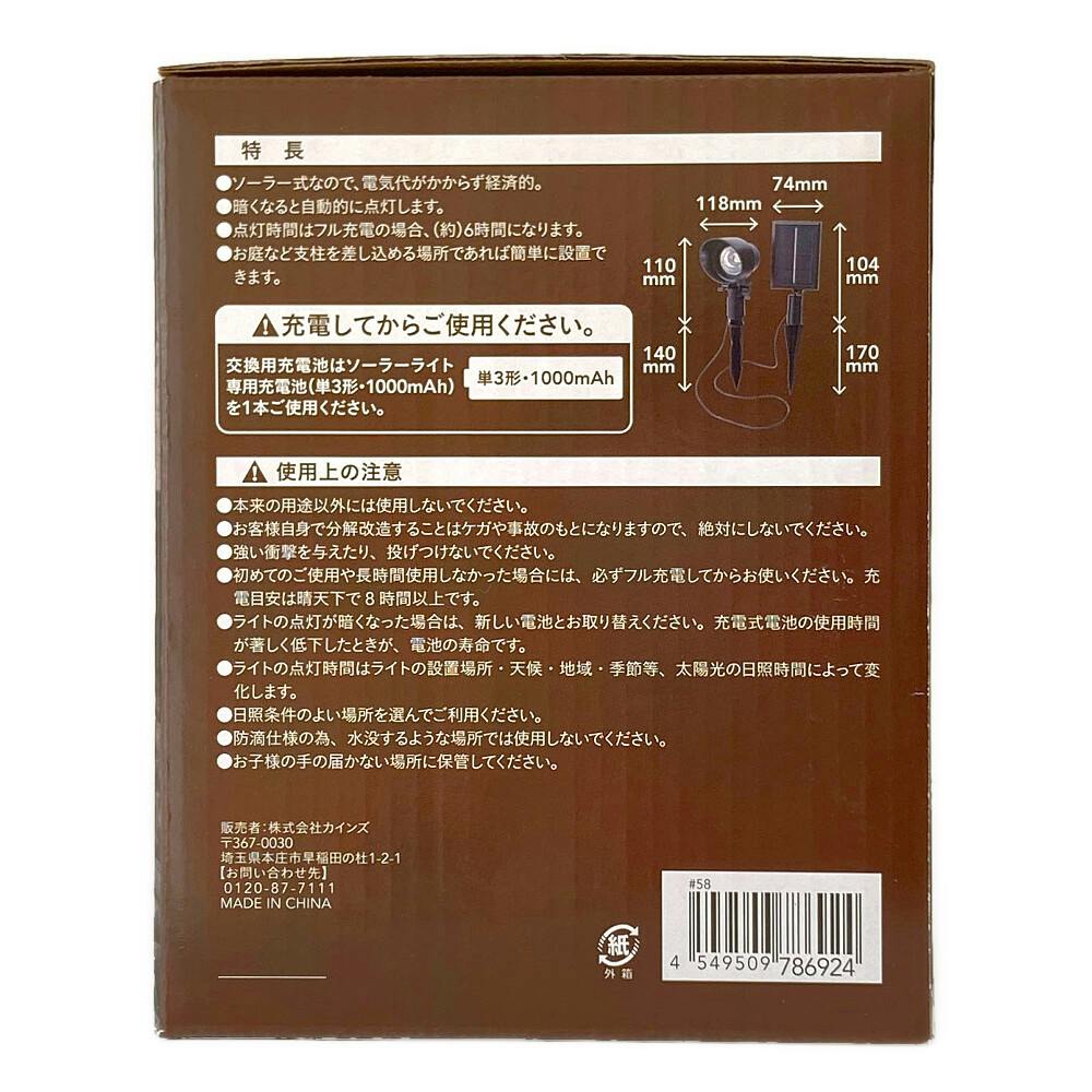 多結晶ソーラーパネル●ニッケル充電池1300mAh単3型 1個●ニチヤSMDホワイトLED 1個●材質 ●本体:ABS樹脂●アンカー: ABS樹脂