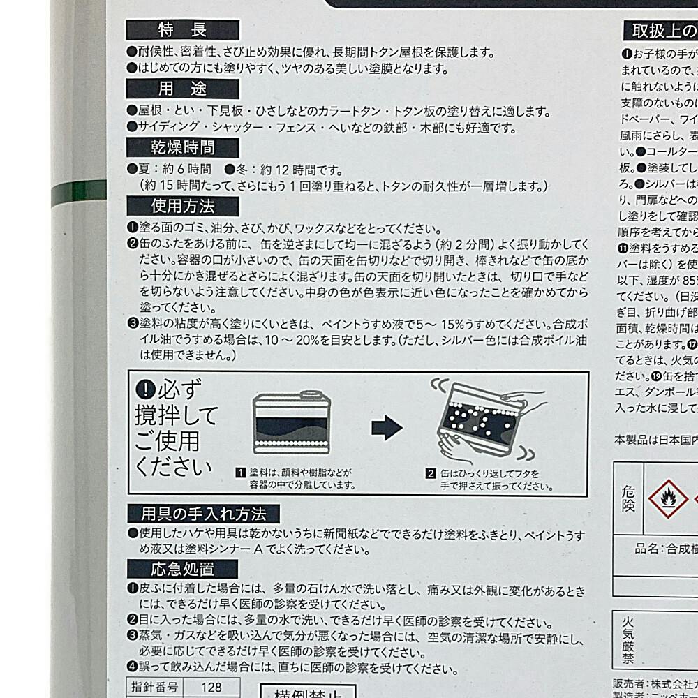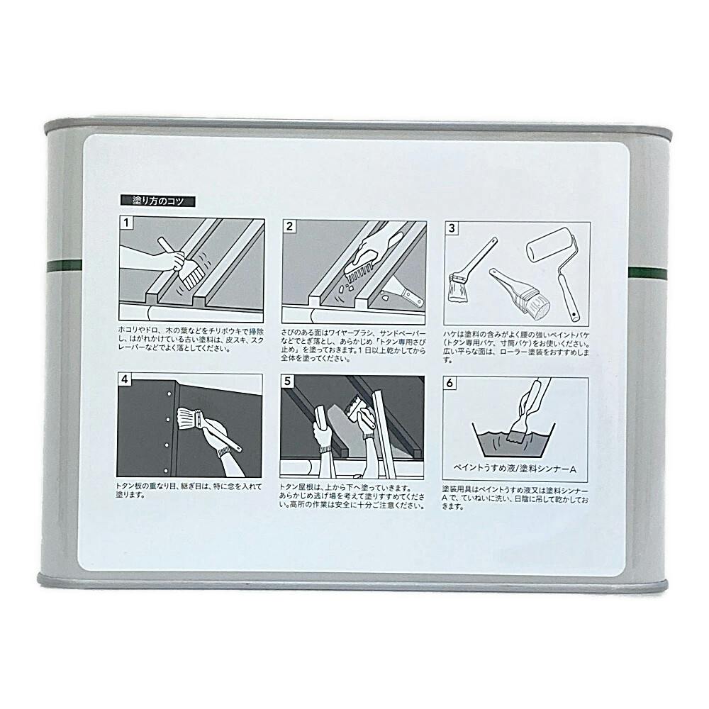 ●日光や風雨に対して、優れた耐久性を持つ合成樹脂塗料です。●さび止め効果に優れ、トタンを保護します。●トタンに対する密着性に優れ、美しい色とツヤが長持ちします。