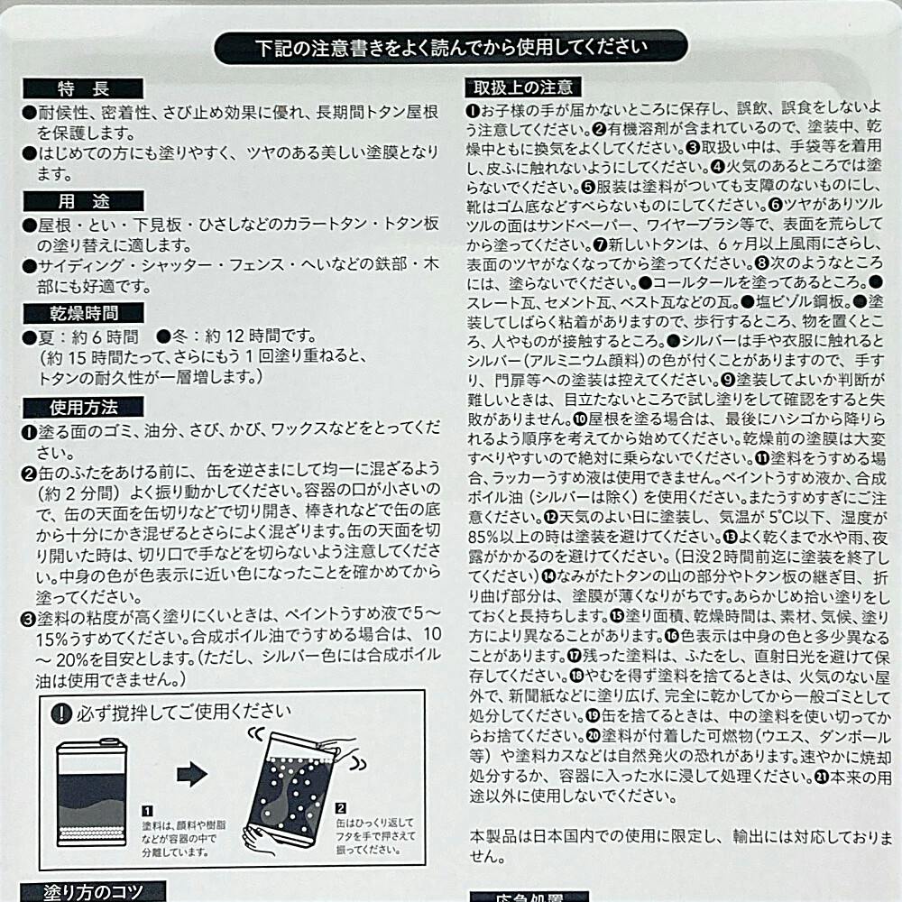 ●日光や風雨に対して、優れた耐久性を持つ合成樹脂塗料です。●さび止め効果に優れ、トタンを保護します。●トタンに対する密着性に優れ、美しい色とツヤが長持ちします。