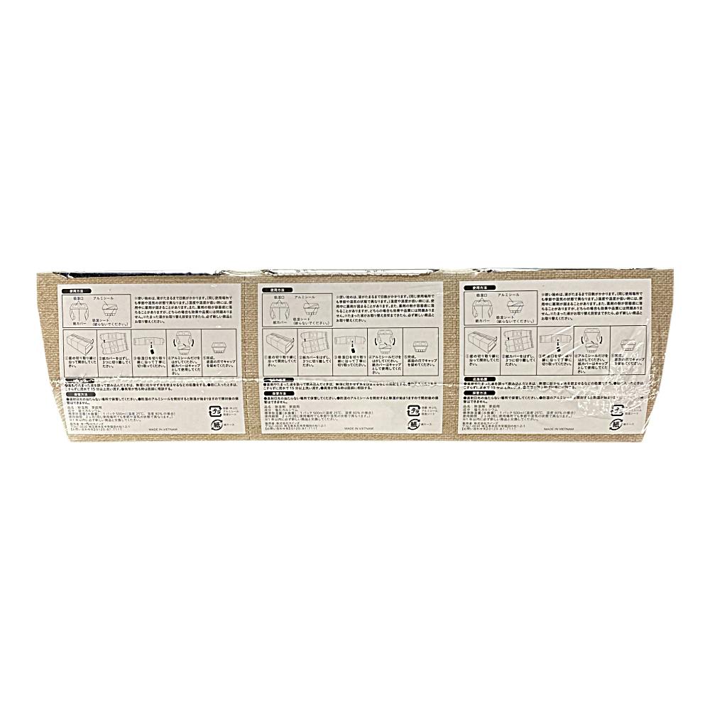 1.底の切り取り線に沿って開封してください。2.紙カバーをはずし、3つに切り離してください。3.吸湿口を切り取り線に沿って丁寧に切り取ってください。4.アルミシールだけをはがしてください。紙カバーはキャップとして使用してください。5.完成。