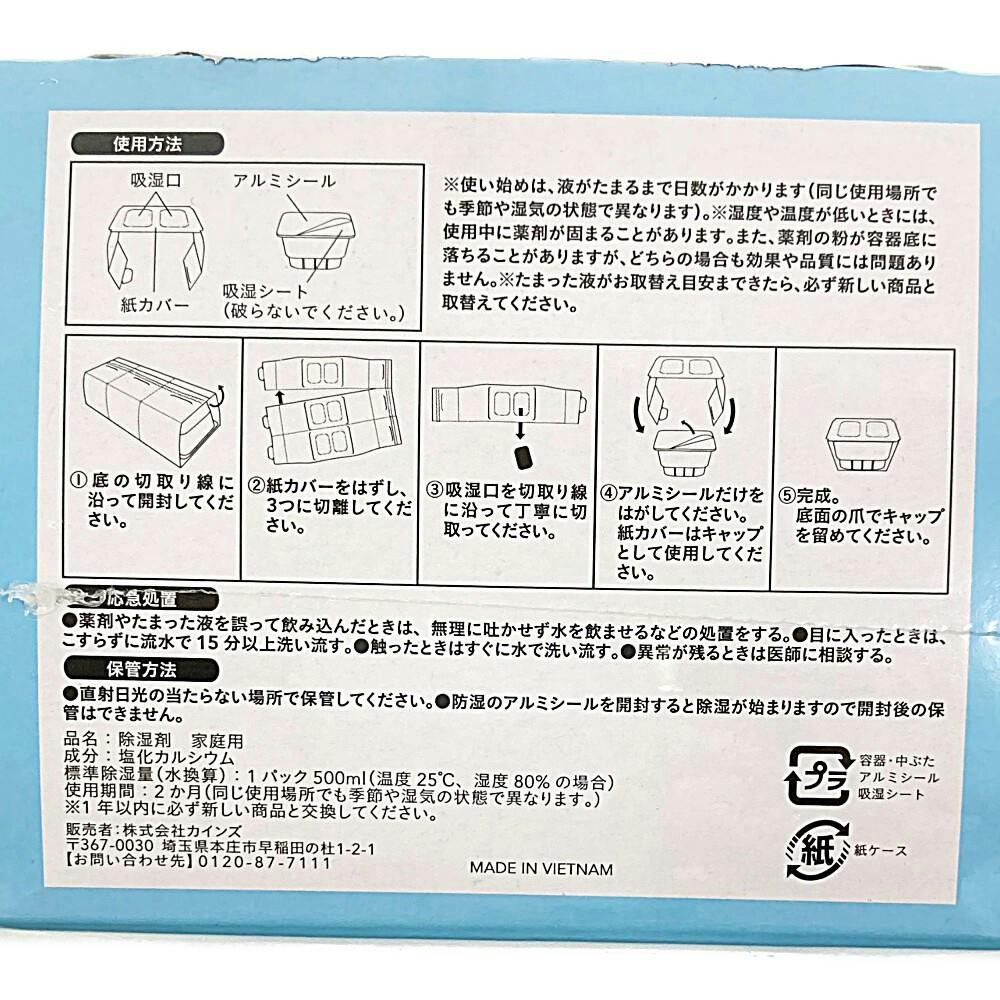 1.底の切り取り線に沿って開封してください。2.紙カバーをはずし、3つに切り離してください。3.吸湿口を切り取り線に沿って丁寧に切り取ってください。4.アルミシールだけをはがしてください。紙カバーはキャップとして使用してください。5.完成。