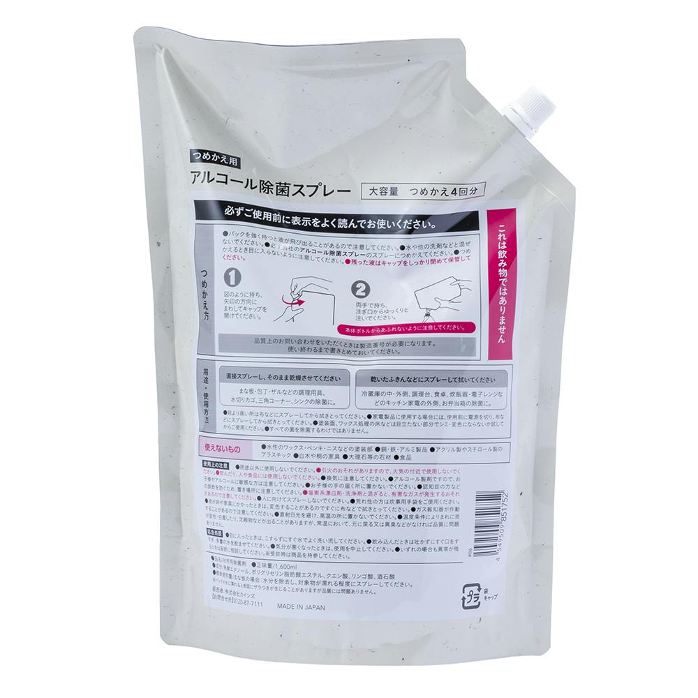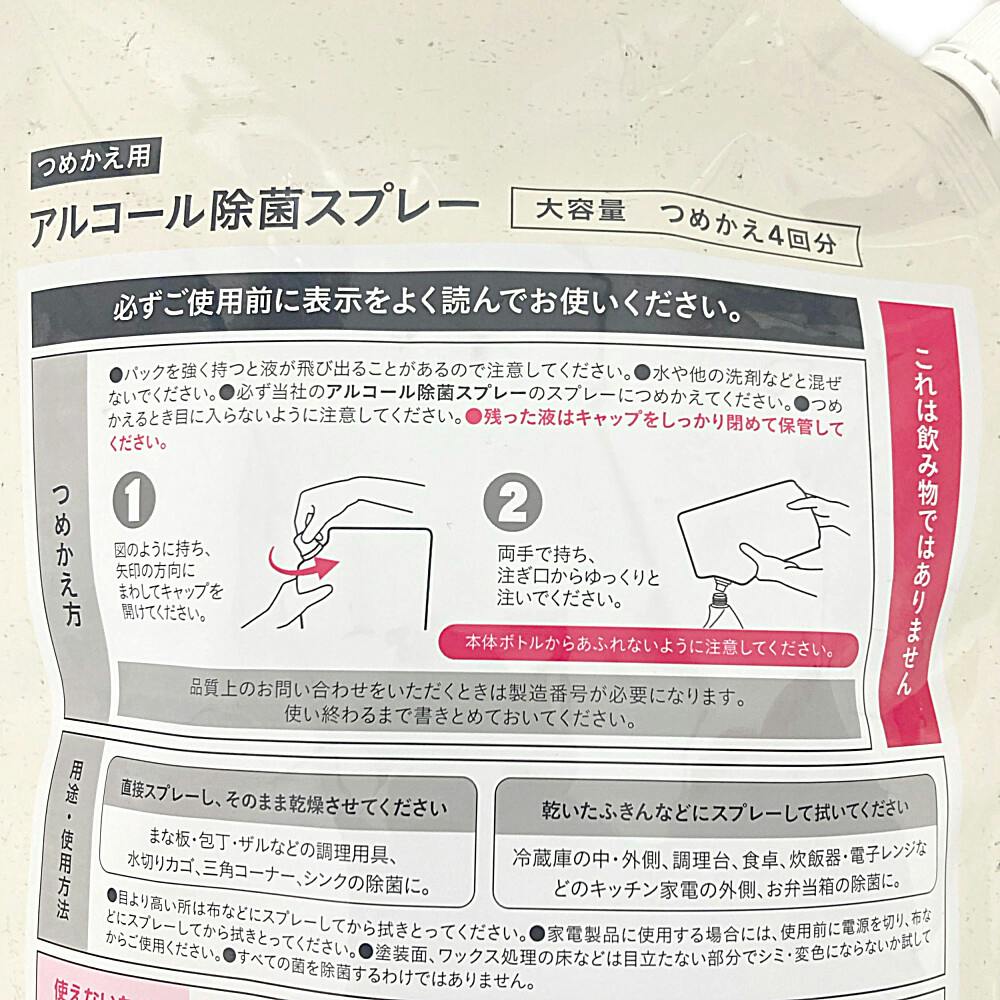 ●つめかえ方/1.矢印の方向にまわしてキャップを開けてください。2.両手で持ち、注ぎ口からゆっくりと注いでください。本体ボトルからあふれないように注意してください。●必ずアルコール除菌スプレーのスプレーにつめかえてください。