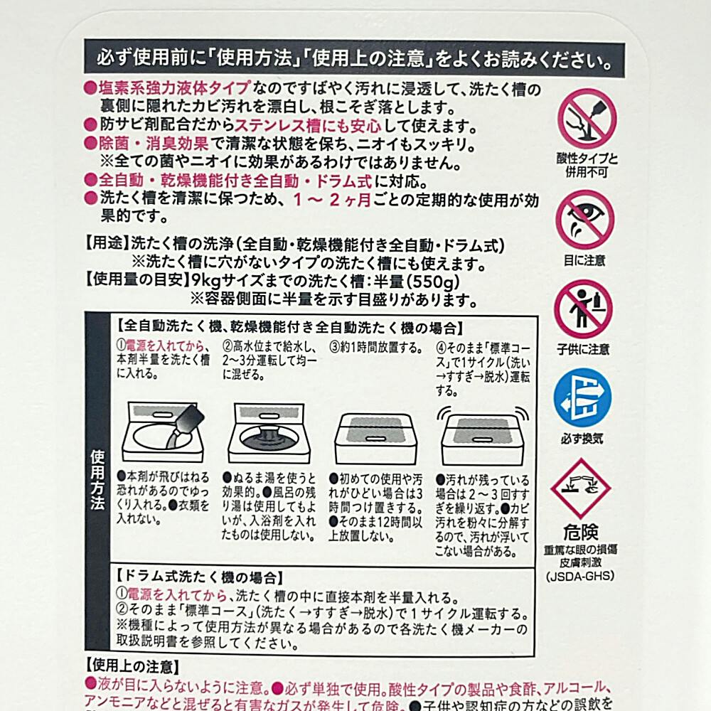 ●塩素系強力液体タイプなのですばやく汚れに浸透して、洗たく槽の裏側に隠れたカビ汚れを漂白し、根こそぎ落とします。●防さび剤配合だからステンレス槽にも安心して使えます。●除菌・消臭効果で清潔な状態を保ち、ニオイもスッキリ。など