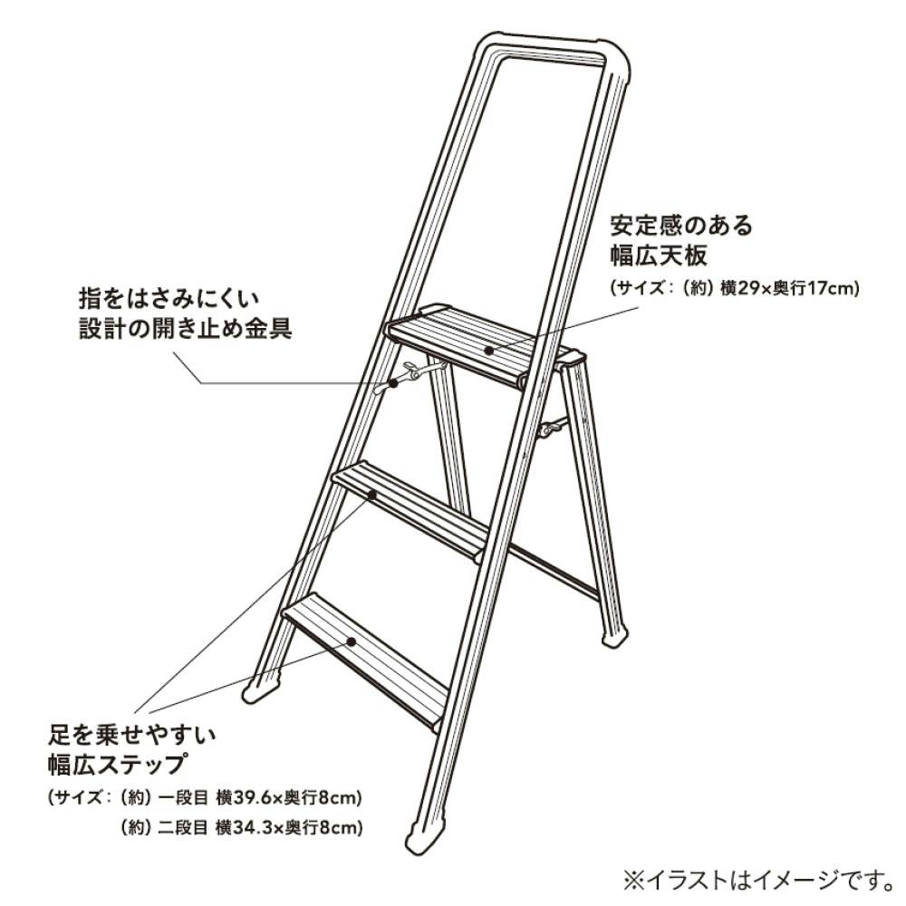 ●屋外使用厳禁 ●警告/立て掛け使用厳禁、重量物や大きな荷物を持っての昇降禁止、不安定な場所使用禁止、手や指を挟まないよう注意(製品開閉時に可動部や開き止め金具で手をはさむおそれがあり危険)、踏み台としての用途以外で使わないこと。など