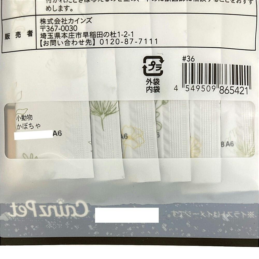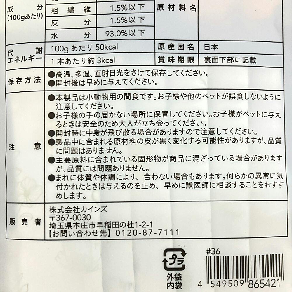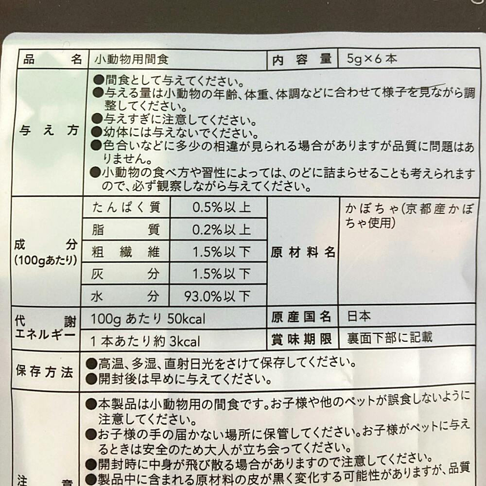 ●本製品は小動物用の間食です。お子様や他のペットが誤食しないように 注意してください。●まれに体質や体調により、合わない場合もあります。何らかの異常に気 付かれたときは与えるのを止め、早めに獣医師に相談することをおすす めします。