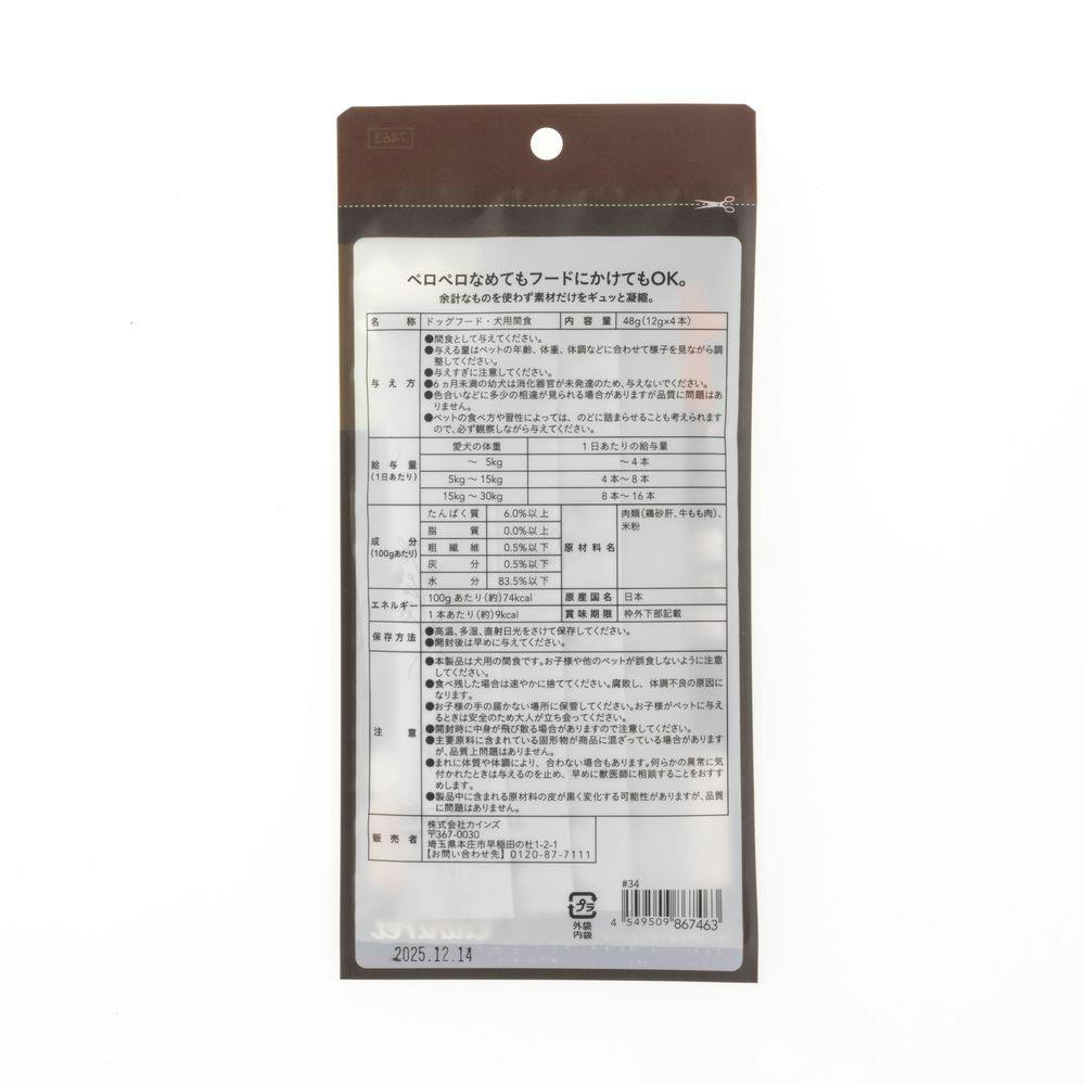 ●間食として与えてください。●与える量は、ペットの年齢、体重、体調などに合わせて様子を見ながら調整してください。●与えすぎに注意してください。●6ヵ月未満の幼犬は消化器官が未発達のため、与えないでください。等