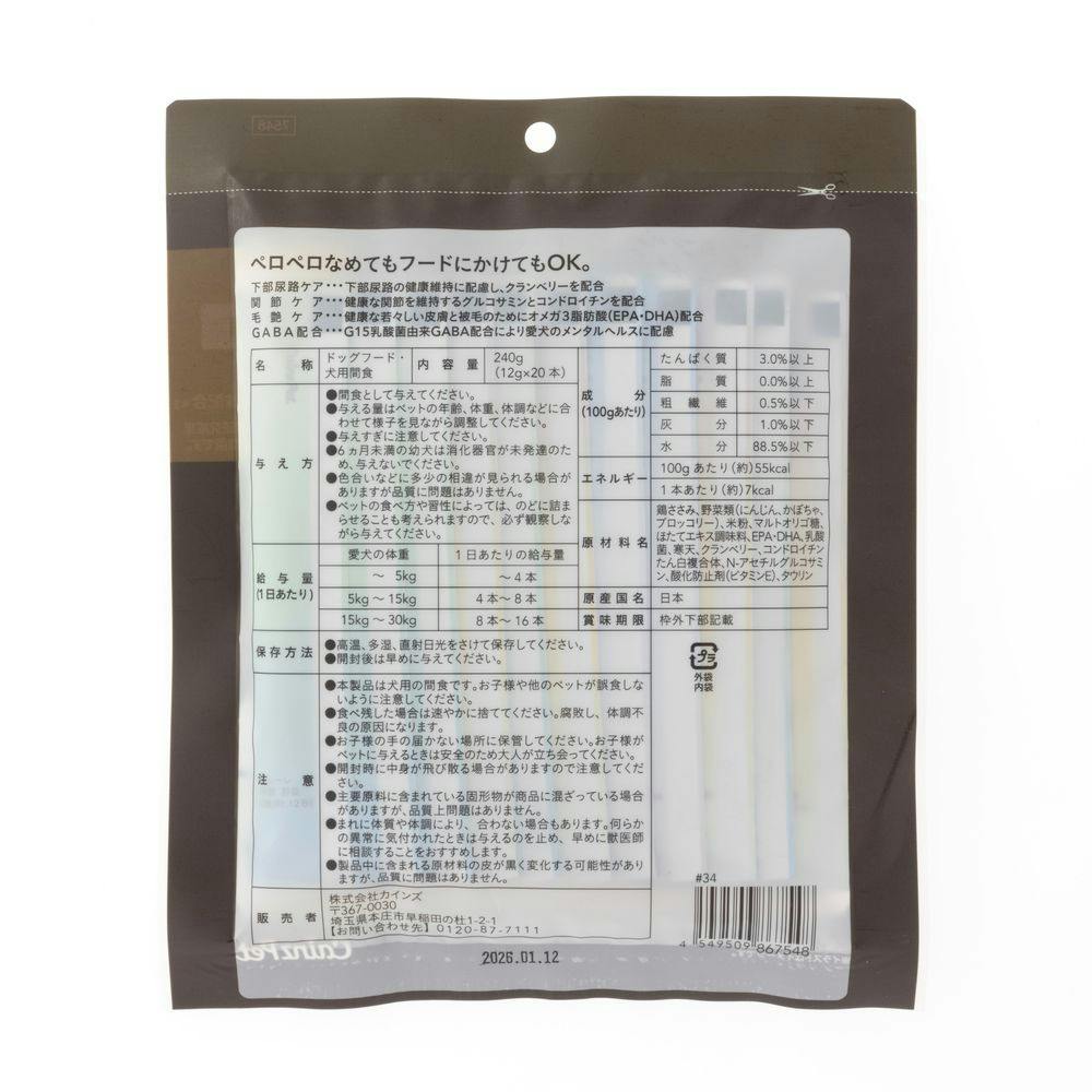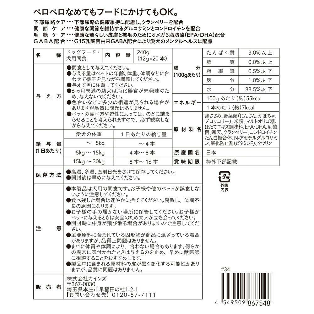 鶏ささみ、野菜類(にんじん、かぼちゃ、ブロッコリー)、米粉、マルゴオリゴ糖、ほたてエキス調味料、EPA・DHA、乳酸菌、寒天、クランベリー、コンドロイチンたん白複合体、N-アセチルグルコサミン、酸化防止剤(ビタミンE)、タウリン