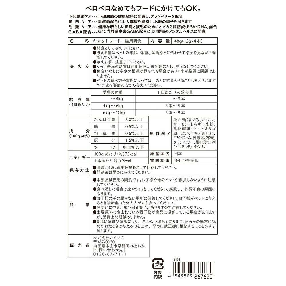 ●間食として与えてください。●与える量は、ペットの年齢、体重、体調などに合わせて様子を見ながら調整してください。●与えすぎに注意してください。●6ヵ月未満の幼猫は消化器官が未発達のため、与えないでください。等