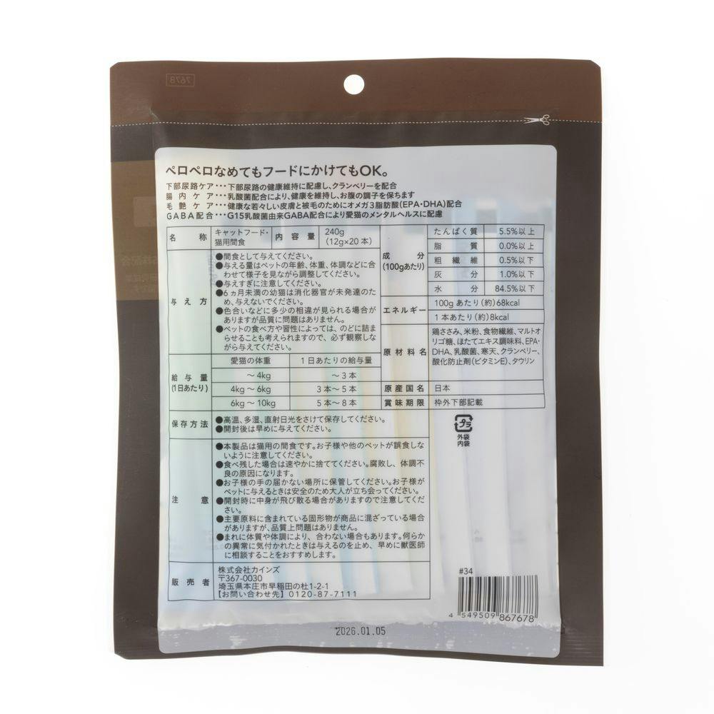 ●間食として与えてください。●与える量は、ペットの年齢、体重、体調などに合わせて様子を見ながら調整してください。●与えすぎに注意してください。●6ヵ月未満の幼猫は消化器官が未発達のため、与えないでください。等