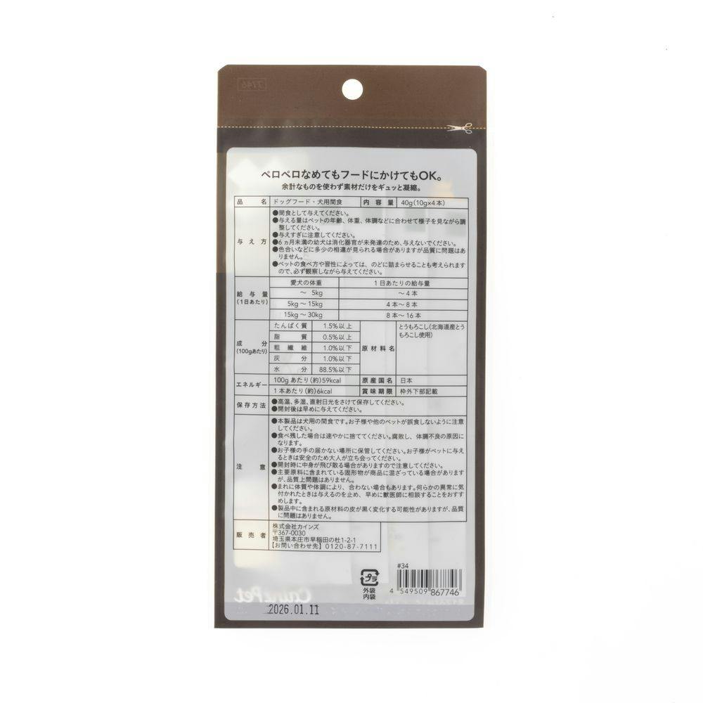 ●間食として与えてください。●与える量は、ペットの年齢、体重、体調などに合わせて様子を見ながら調整してください。●与えすぎに注意してください。●6ヵ月未満の幼犬は消化器官が未発達のため、与えないでください。等